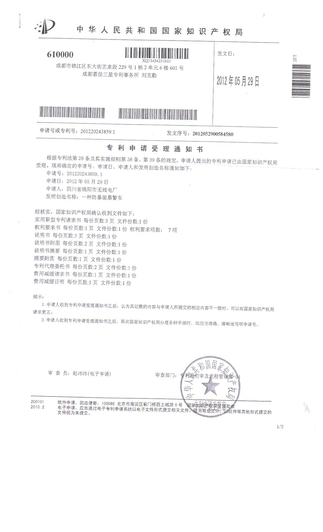 近日我司已收到中華人民共和國國家知識產(chǎn)權(quán)局對我司提出的防暴驅(qū)暴警車的專利申請予以受理的專利申請受理通知書,確認已受理,專利申請?zhí)枺?0120243859.1