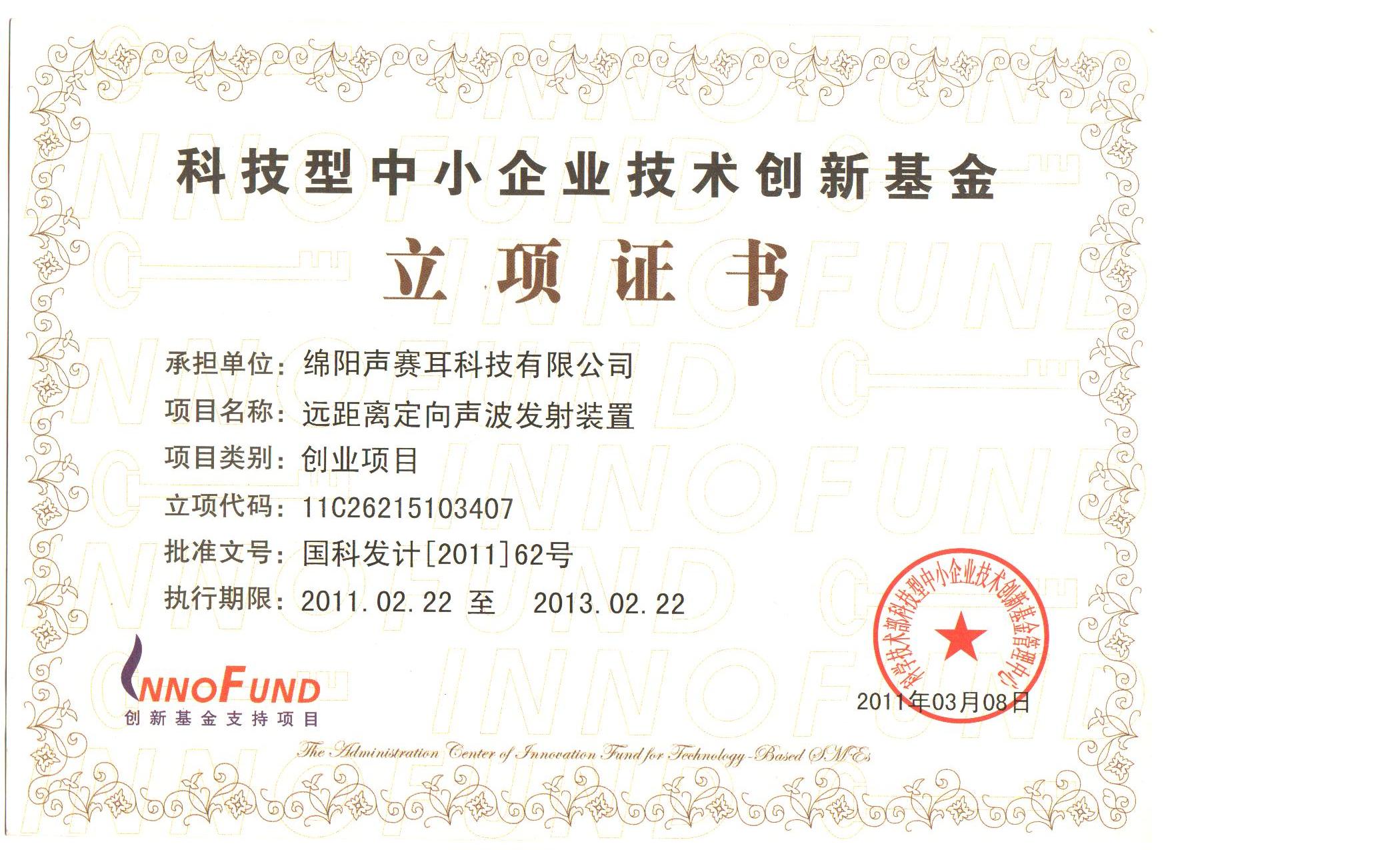 2011年9月16日,我公司正式取得中華人民共和國科學(xué)技術(shù)部中小企業(yè)技術(shù)創(chuàng)新基金管理中心簽發(fā)的“遠(yuǎn)距離定向聲波發(fā)射裝置”立項(xiàng)證書,這標(biāo)志著我公司科技創(chuàng)新取得重大突破。